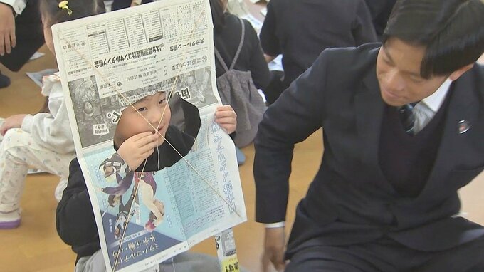 大分県佐伯市で8日、こども園の園児が高校生に教わりながら、新聞紙を使った凧作りに挑戦しました。