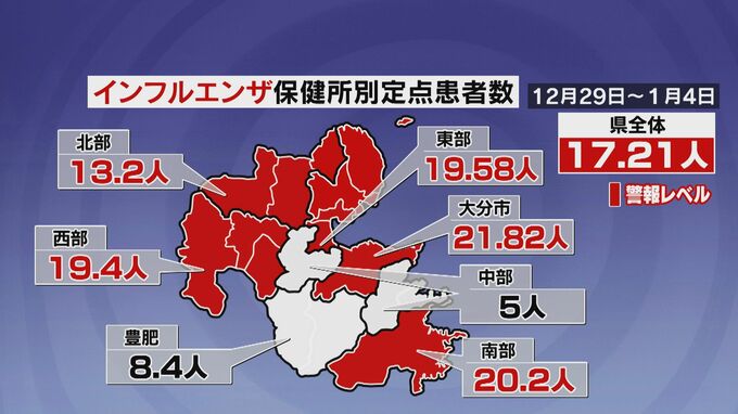 保健所別では、大分市が21.82人と最も多く、南部や東部、西部でも高い水準が続いています。全体の患者数は3週連続で減少していますが、調査期間が医療機関が休業する年末年始に重なっているため、県は警報を継続し、警戒を緩めないよう求めています。