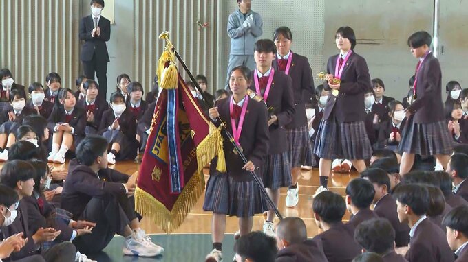 優勝報告会では、金メダルを胸にした選手たちが全校生徒や職員の盛大な拍手に迎えられ入場。チームを率いた田淵聖那キャプテンが、支えてくれた周囲への感謝を述べました。