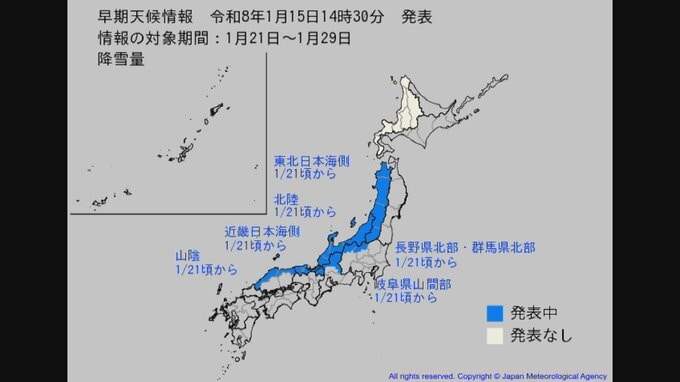 気象庁は日本全国に「低温に関する早期天候情報」を発表しました。1月21日頃から冬型の気圧配置が強まる時期があり、気温の低い日が多くなる可能性があります。また、東北から中国地方の日本海側の地域を中心に、この時期としては降雪量がかなり多くなる可能性があるとして、「大雪に関する早期天候情報」も発表されています。交通障害や除雪などの対応に留意するとともに、農作物の管理に注意が必要です。