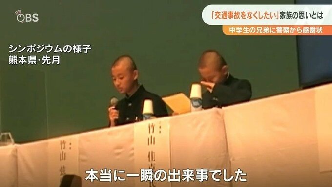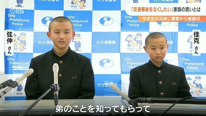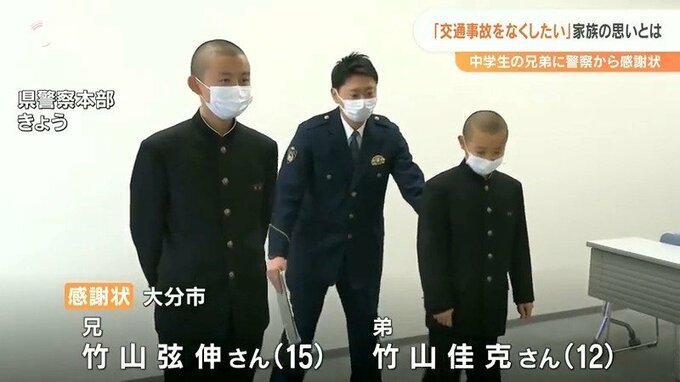 警察庁から感謝状が贈られた大分市の中学3年生、竹山弦伸さん(15)と1年生の弟、佳克さん(12)です。2人は11月、熊本で開かれたシンポジウムで交通事故の撲滅を訴えました。兄弟が講演を引き受けた理由、それは…