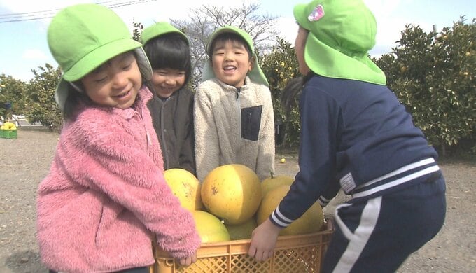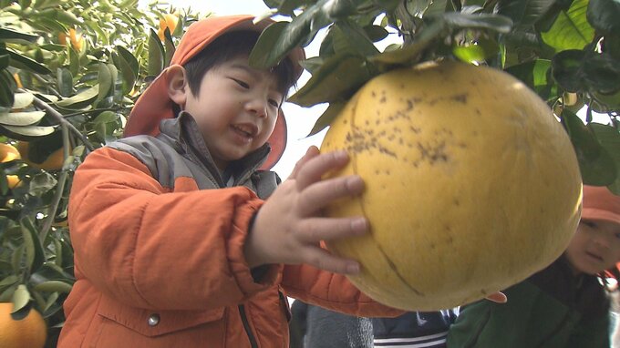 大分市ののだ山幼稚園では、食べ物への感謝の気持ちを持ってもらおうと毎年晩白柚とパール柑の収穫体験を行っています。