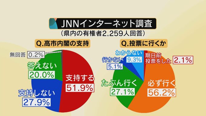 この調査では、県内の有権者2259人から回答を得ました。高市内閣について「支持する」が51.9パーセント。「支持しない」が27.9パーセント。また、投票については「期日前投票をした」「必ず行く」を合わせると58.3パーセントになります。