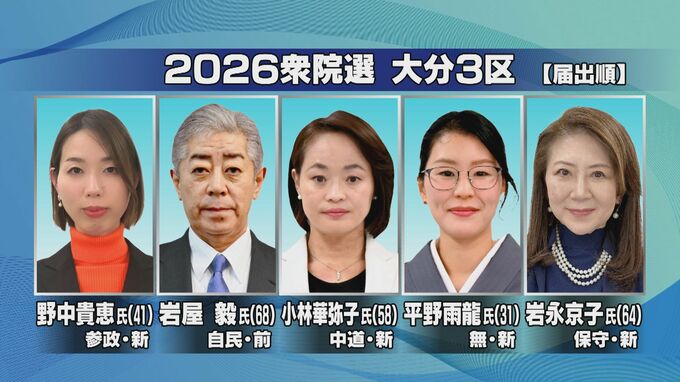 大分3区には前職と新人4人の合わせて5人が立候補しています。大分3区は岩屋さんと小林さんが競り合い、岩永さん、平野さんと野中さんは支持拡大に懸命です。