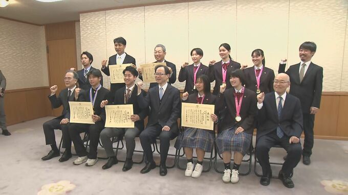このほか、男子テニスのジュニアオリンピックで優勝した大分舞鶴高校2年の太田周選手、テニスの全日本選手権で優勝した田口涼太郎選手(Team REC)、全日本ボクシング選手権で優勝した山田月琴選手(東洋大学1年)に県民表彰が贈られました。