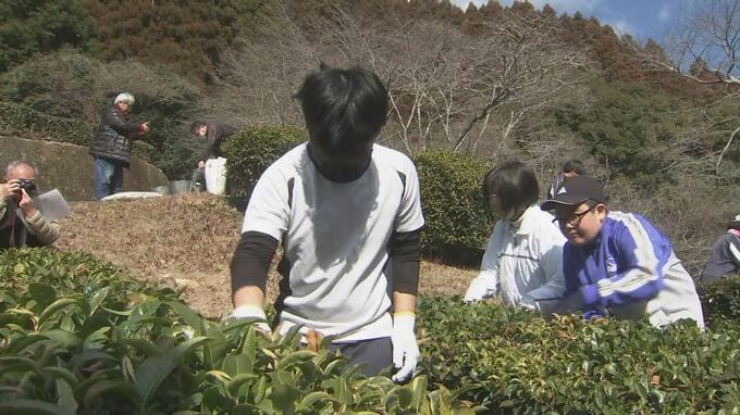 大分県内の茶の産地の一つ佐伯市本匠で、地元の中学生が新茶の時期に向けて学校の茶園で農作業を体験しました。