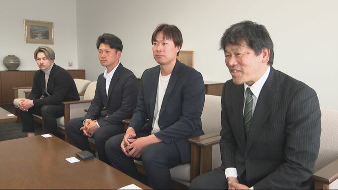 OBS本社を訪れたのは、今シーズンから指揮をとる水本大志選手兼監督(28)や大分市出身の笠谷俊介投手(28)ら4人です。