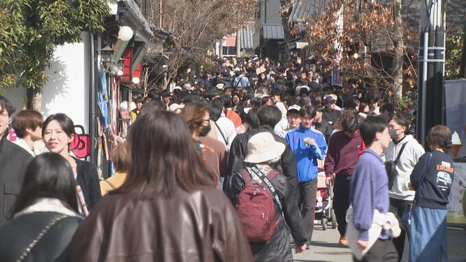 (観光客)「温泉に入りに来てて、きょうはとても暖かいので食べ歩きにも来ました」「きょうは暖かくて服を2枚脱ぎました」