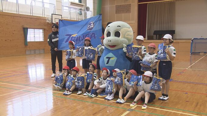 このあと、トリニータのキャラクター「ニータン」が登場し、児童たちにトリニータグッズがプレゼントされました。