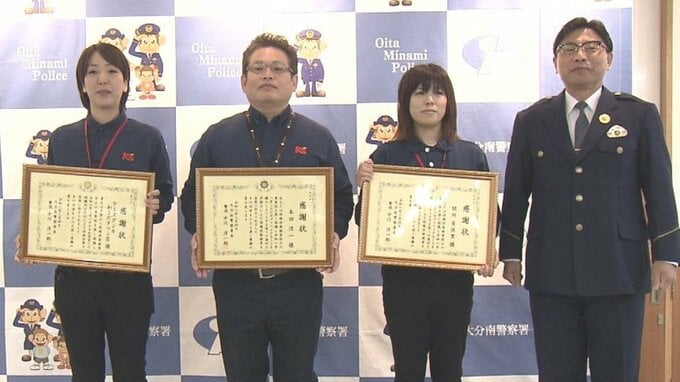 大分南警察署の中川洋一郎署長は4日、「皆さんの行動が県民の模範となる」とその功績を称え、3人に感謝状を手渡した。