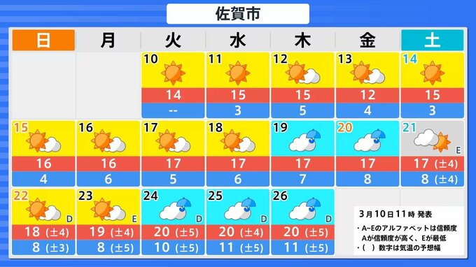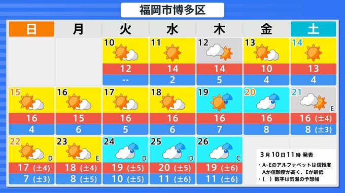 九州・四国で3月19日頃から10年に一度レベルの高温の可能性 気象庁が「早期天候情報」発表 2026年3月10日(火) 15:47 国内 天気 ■九州北部地方(山口県を含む) 3月19日頃からかなりの高温となる見込みです。5日間平均気温平年差は+2.6℃以上とされています。