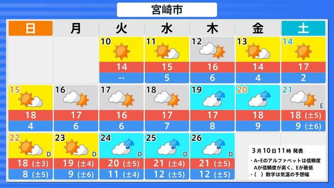 九州・四国で3月19日頃から10年に一度レベルの高温の可能性 気象庁が「早期天候情報」発表 2026年3月10日(火) 15:47 国内 天気 ■九州南部・奄美地方 九州南部においても3月19日頃からかなりの高温となる見通しです。5日間平均気温平年差は+2.5℃以上と予測されています。
