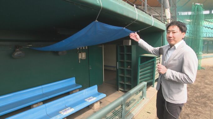 「選手たちが使用する1塁側のベンチです。天井から水が漏れ出しているほか、足元を見てみると土台が崩れかかっているのがわかります」