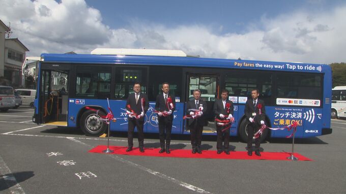 セレモニーでは亀の井バスの関係者らがテープカットをし、新システムの導入を祝いました。亀の井バスで利用できるようになるのは、クレカ乗車と呼ばれるシステムです。これまで45都道府県の交通事業者が採用していて、県内のバス会社では初めての導入です。