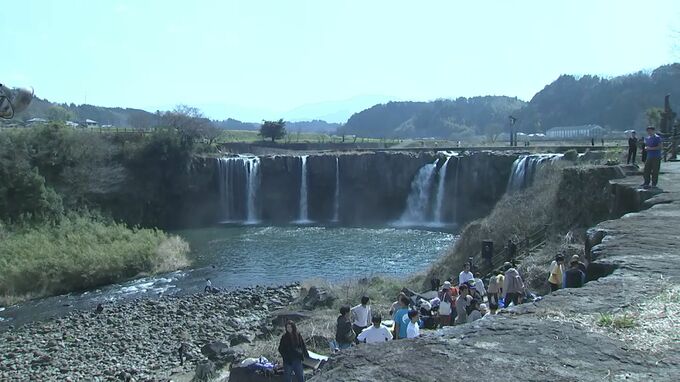 大分県内有数の観光スポット、豊後大野市緒方町の原尻の滝で20日、ボルダリングの体験会が開かれ、参加者が豪快な水しぶきを間近で感じながら岩壁を登りました。