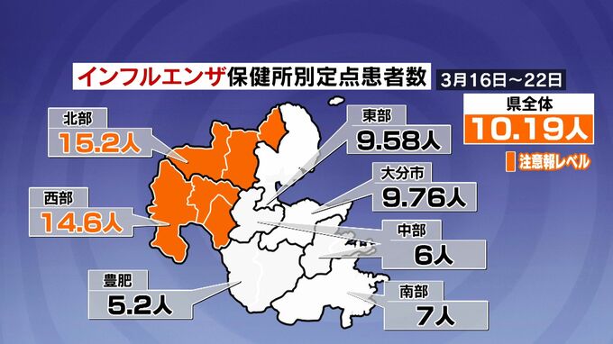 大分県内のインフルエンザの患者数は、減少傾向にあるものの、依然警報基準を上回っていて、発令期間が過去最長に並びました。