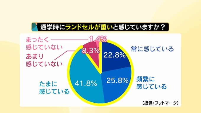 学校用品メーカー「フットマーク」の調査によりますと、教科書などを入れたランドセルの平均重量は、初めて4キロを下回る3.94キロとなりました。しかし、回答した小学1年生から3年生の9割が、依然として通学時に「重い」と感じています。