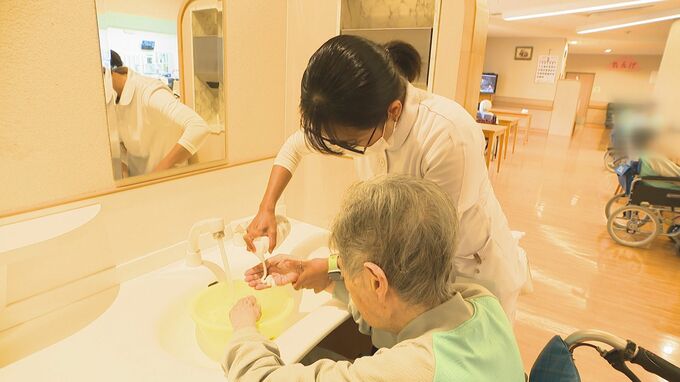 彼女たちの仕事は、認知症患者の食事・入浴・排泄などを介助します。一人ひとりに声をかけてコミュニケーションを取りながら接します。