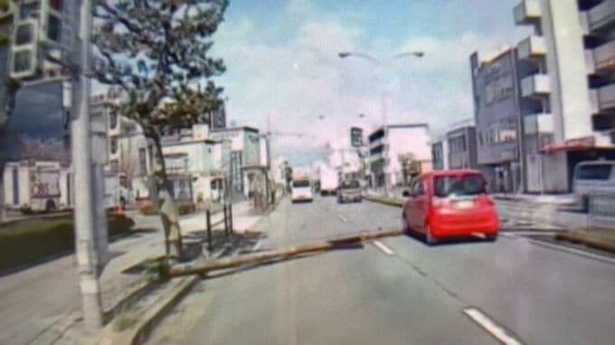 4月4日午後3時半ごろ、大分市今津留の国道197号で複数台の車が走行中、道路左側に設置された街灯が突然、倒れ込んできました。ドライブレコーダーが、その緊迫の瞬間を捉えていました。