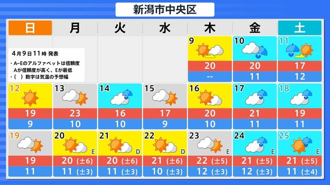 北陸地方の向こう2週間の気温は、暖かい空気に覆われやすいため高く、かなり高い日も多い見込みです。農作物の管理等に注意してください。積雪の多い地域ではなだれに注意してください。また、今後の気象情報等に留意してください。
