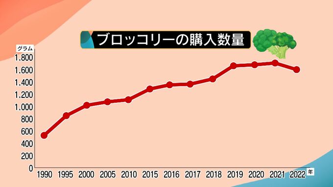 農林水産省によりますと、1人当たりのブロッコリー購入数量は2022年までの32年間で、およそ3倍に増加。健康志向の高まりを背景に、ジャガイモ以来、52年ぶりに追加されました。