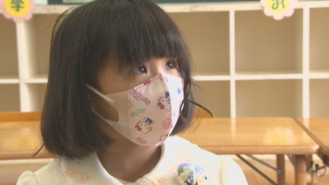 緊張した面持ちで教室に入る、高橋詠さん。臼杵市の佐志生小学校の新1年生です。