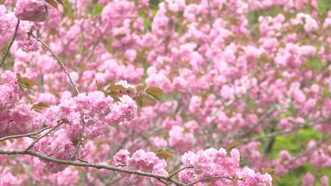濃いピンクの花が可憐なボタンザクラは今月22日までが見頃だということです。