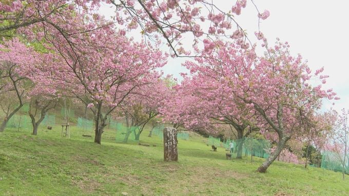 豊後大野市大野町のえぼし岳中腹・標高500メートルに位置する公園にはおよそ100本のボタンザクラが植えられていて、いま見頃を迎えています。
