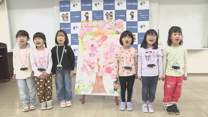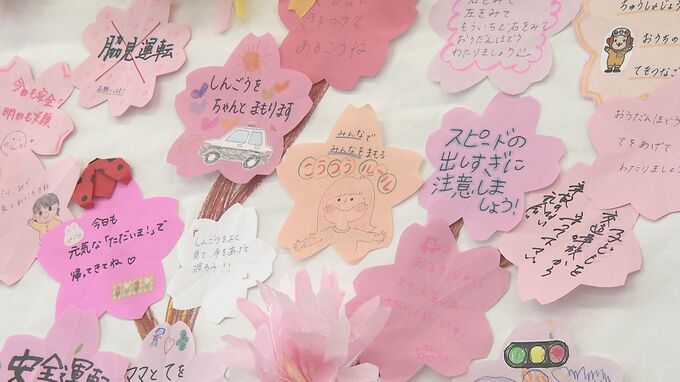 大分県日出町の保育園児が24日、交通安全への願いを込めたメッセージを桜の花びらに書き込んで警察署に飾り付けました。