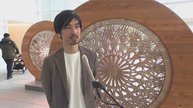 1階アトリムで披露されたには「時の縁にてpassage of time」と名付けられた作品で、大分市出身のアーティスト・穴井佑樹さんがデザインを手がけました。日田杉で作られた巨大な円形パネルがゆっくりと回転するオブジェで、豊かな自然の中で紡がれる時間のうつろいを表現しているということです。