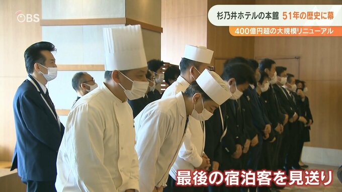 1944年に温泉旅館として始まった杉乃井ホテル。本館は1971年に開業したメインの宿泊棟として、多くの利用者に親しまれてきました。開業から半世紀あまりを経て、施設が老朽化した本館は16日をもって、閉館することになりました。チェックアウトの時間にあわせて全館のスタッフがロビーに集まり。最後の宿泊客を見送りました。