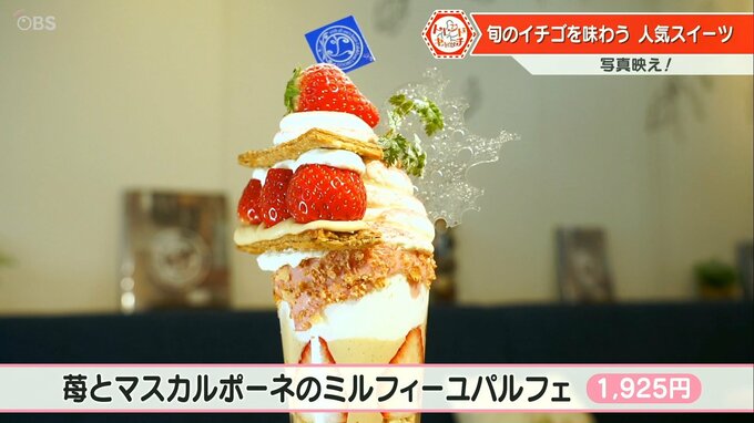 大分市にある「カフェリモージュ」。写真映え間違いなしの人気スイーツ「苺とマスカルポーネのミルフィーユパルフェ」(1925円)を提供しています。