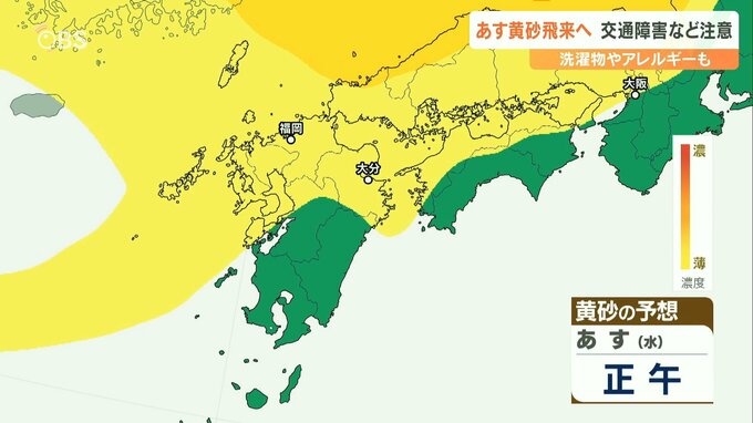 12日大陸から「黄砂」飛来の見込み 交通障害や洗濯物の屋外干し、アレルギーに注意 大分 2023年4月11日(火) 18:22 国内 全国の広い範囲で12日、中国大陸からの黄砂が大分県にも飛来する見込みで、気象台が交通への障害などに注意を呼びかけています。大分地方気象台によりますと11日午前、中国大陸で黄砂が観測されていて見通しの効く…