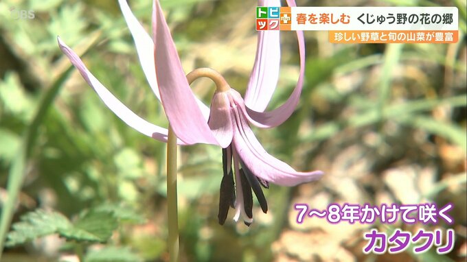 九重町の「くじゅう野の花の郷」は標高830メートルに四季折々の珍しい野草およそ1000種類が自生しています。今見ごろを迎えているのが、ほかの地域ではなかなか群生しないキスミレや7、8年の歳月をかけて咲く紫色のカタクリ。風に揺れる仕草から森の妖精やバレリーナとも例えられます。園内には散策コースが整備されていて、季節の花をじっくりと楽しむことができます。