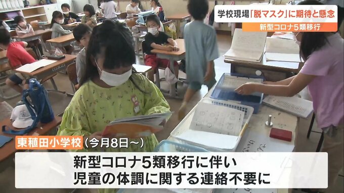 (児童)「マスクは外したり、つけたりしている」「マスクはいつも通りつけています。1人でマスクを外すのは恥ずかしい」「ほぼ外している。授業しやすくなった」