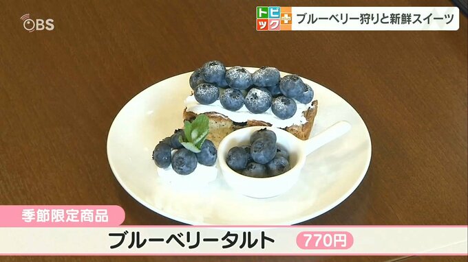 農園に隣接するカフェでは自家製スイーツ「ブルーベリータルト」(770円)が人気を集めています。