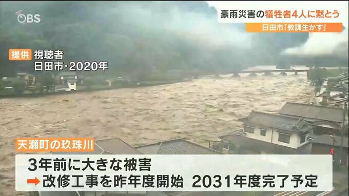 3年前と6年前の豪雨災害により4人が亡くなった大分県日田市で5日、黙とうが捧げられ、防災への誓いを新たにしました。