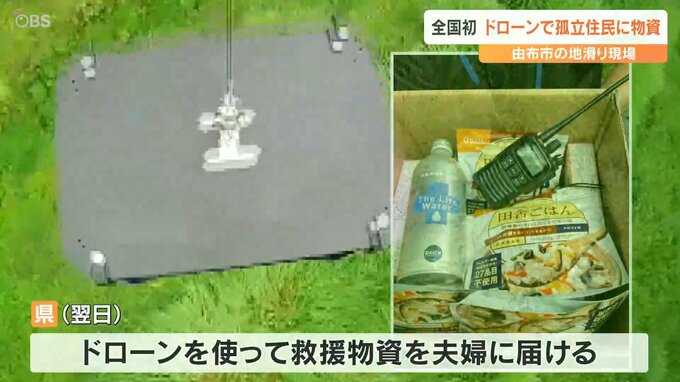 6月30日、由布市湯布院町川西で大雨の影響で地滑りが発生し、住民の夫婦が一時孤立しました。雨で防災ヘリが出動できない中、県は翌日にドローンを使ってトランシーバーや水、レトルト食品などの救援物資を夫婦のもとに届けました。