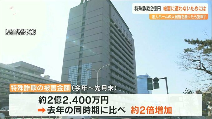 県警によりますと、県内の特殊詐欺の被害額は、7月末までで2億2400万円。去年の同じ時期に比べおよそ2倍、1億円余り上回っています。また、発生件数も123件で増加傾向です。去年を大幅に上回るペースで発生する特殊詐欺被害。中でも目立つのが…「老人ホームへの入居」をかたり、料金を架空に請求する詐欺です。