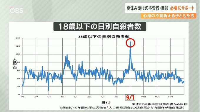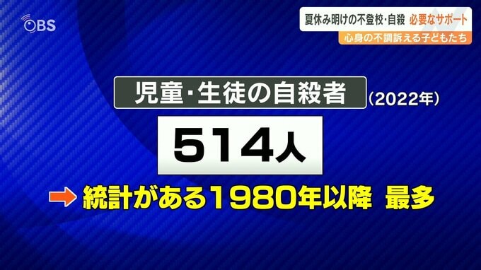 国の調査によりますと、去年の児童・生徒の自殺者数は514人で統計が残る1980年以降で最多となりました。内訳としては、小学生が17人、中学生が143人、高校生が354人となっています。中でも夏休みが終わる9月1日ごろ、自殺に追い込まれてしまう子どもたちが突出して多くなっています。