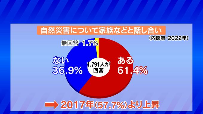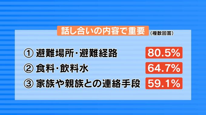 去年、内閣府が実施した調査によりますと、自然災害について家族などと話し合ったことがある人はおよそ6割で、6年前と比べてわずかに上昇しています。また話し合う内容として重要と挙げられたのが「避難場所・避難経路」で8割を超えています。次いで「食料・飲料水」「家族や親族との連絡手段」となっています。