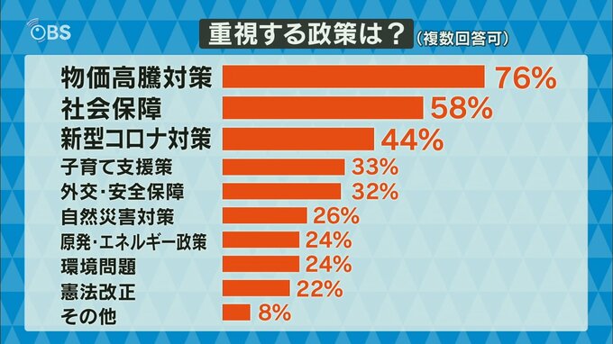 「選挙で重視する政策」(複数回答可)で最も多かったのは「物価高騰対策」の76%、次いで「社会保障」が58%、「新型コロナ対策」が44%、「子育て支援策」が33%、「外交・安全保障」が32%。生活に直結した課題への関心の高さがうかがえる結果となりました。