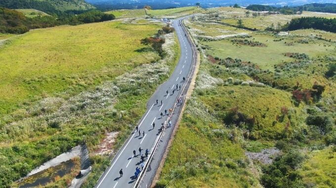 今回、ゴール地点まで25グラム以上のそうめんが流れ着いたら、ギネス記録に認定されます。序盤は下り坂の傾斜もあり、牧草地から県道エリアに入っても問題なく、前に進んでいきます。