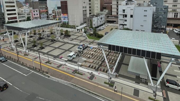 屋根はガラス製で、長さ19m、幅16~18m、高さ8~11mの大小2基を設置。日よけや雨よけの機能を有し、天候に影響されにくい広場の利活用が可能。屋根の側面に設置されているソーラーパネルで発電する電気を使用して動きます。