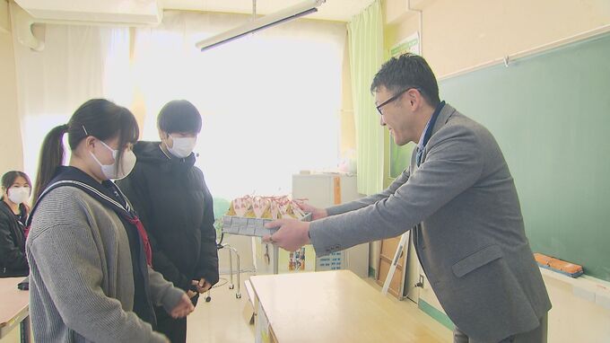 大分市にある道の駅のつはるでは、高校受験を控えた野津原中学校の3年生に毎年“落ちない梅”を贈呈しています。道の駅の立川雅和理事長が22日、中学校を訪れ、生徒に梅干しを手渡しました。