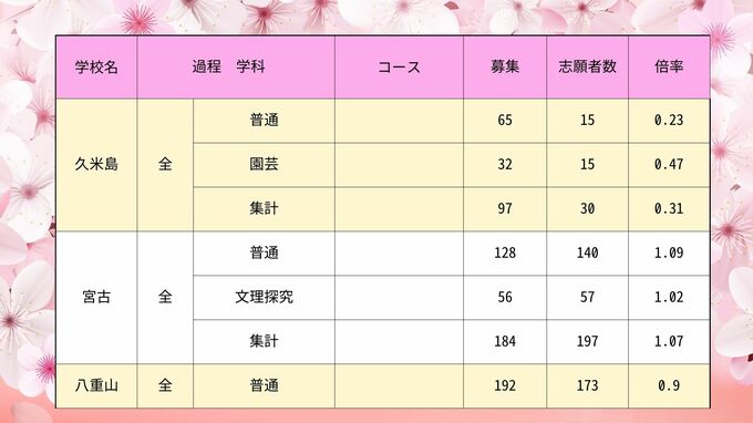 【全校掲載】沖縄県県立高校入試2024 最終志願倍率、全日制は0.95倍 具志川商業や首里高校が高倍率に 各学校の出願状況は 2024年2月22日(木) 11:00 国内 イベント・その他 向陽・知念・糸満・久米島・宮古・八重山