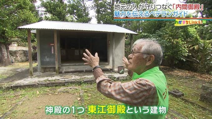 ニシバル歴史の会・顧問の長嶺一男さん(81)は、琉球王国の歴史に詳しく、定年退職後にこれまでに読んだ関連書物は300冊以上!学んだ知識を活かして、10年あまりガイドを続けています。サガリバナや、樹齢数百年を超えるフクギなど自然豊かな景色のなかを奥へ進んで行くと、厳かな建物が姿を現します。