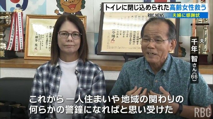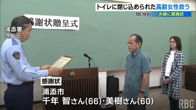 トイレに閉じ込められた1人暮らしの高齢者を見つけ救助に貢献したとして、浦添市の夫婦に警察から感謝状が贈られました。