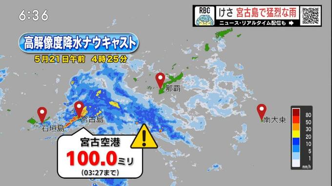 21日の朝は宮古島付近で活発な雨雲が発生。 宮古空港では1時間に100ミリ、観測史上最も強い猛烈な雨となりました。