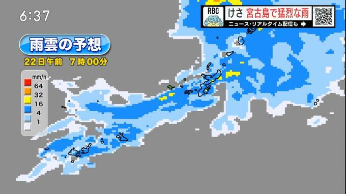 今夜からあす22日にかけても前線に伴う活発な雨雲が流れ込み、 本島地方や先島諸島では多い所で1時間に40ミリの激しい雨が降る見込みです。